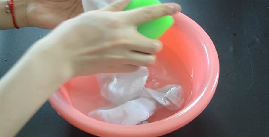 接著把浸泡好的白襪子拿出來,涂上一些牙膏,雙手搓一搓。搓完之后,再把襪子放在水里繼續浸泡3分鐘左右。牙膏也可以洗白髮黃的白襪子。