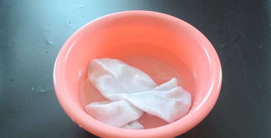 然后往盆子里加入一些小蘇打,并且把又黃又臟的白襪子放在盆子里浸泡10分鐘。小蘇打具有去污和洗白的作用。